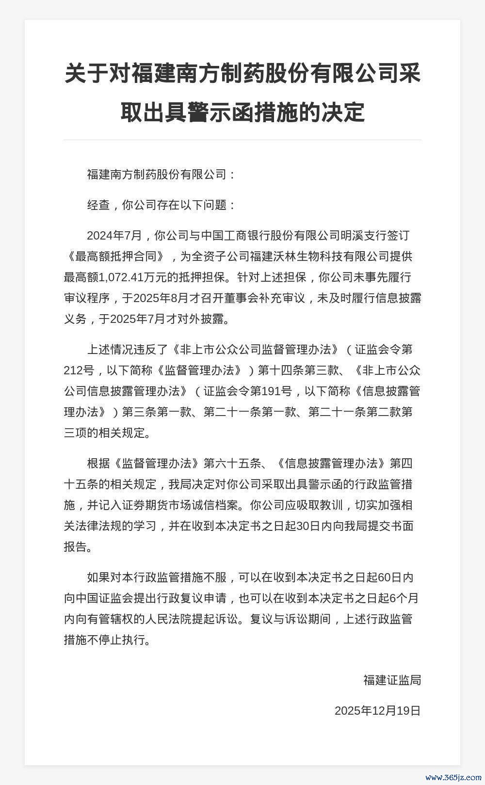 决定书闪现,福建南边制药股份有限公司存在以下问题:2024年7月,公司与中国工商银行股份有限公司明溪支行刚毅《最高额典质公约》,为全资子公司福建沃林生物科技有限公司提供最高额1,072.41万元的典质担保。针对上述担保,公司未预先实践审议形式,于2025年8月才召开董事会补充审议,未实时实践信息流露义务,于2025年7月才对外流露。